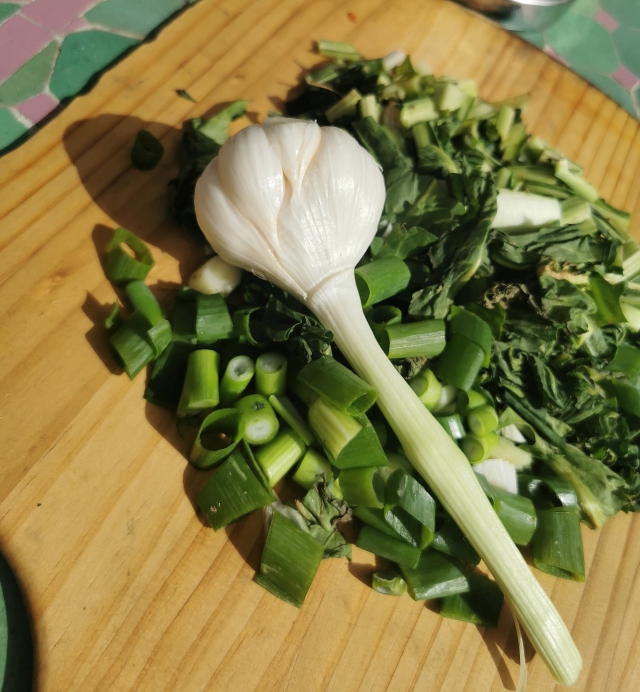השבוע, ממש לפני פסח, עוד הספקתי לחבר בין שתי עונות – לקטוף עולש בר ולהקפיץ אותו עם השום הטרי, פרוס. סלט עולש