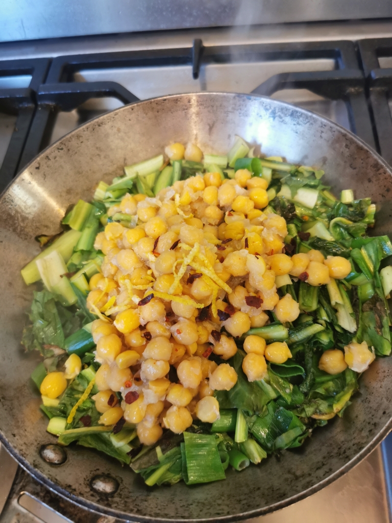 פורסים דק את השום, מקפיצים במחבת גדולה עם העולש ושמן הזית ומוסיפים אחרי דקה את הבצל הירוק. ממשיכים להקפיץ ומגרדים מלמעלה קליפת לימון. סוחטים מיץ לימון ומוסיפים, ועכשיו מוסיפים את גרגרי החומוס, ללא נוזלי הבישול. בוזקים מלח, מערבבים ומחלקים לכלי הגשה.