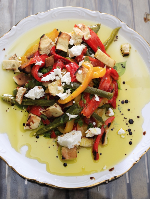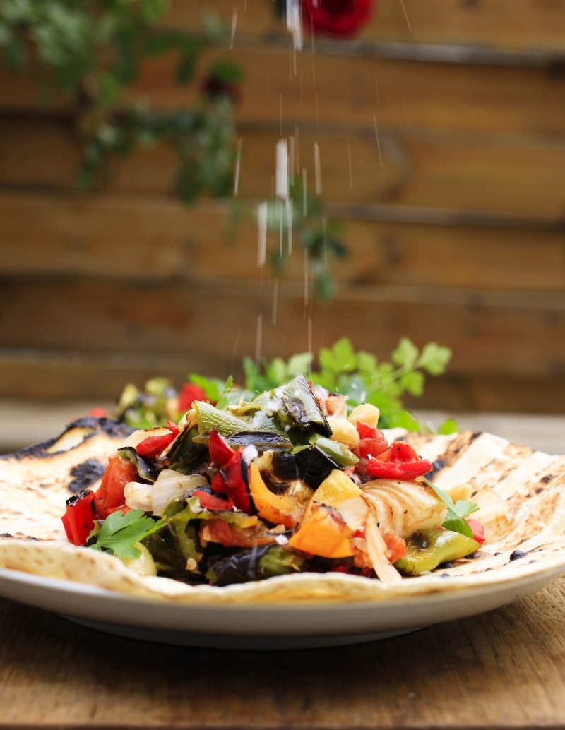 מברישים את רשת הדגים בשמן זית, ומסדרים בה את הירקות. סוגרים בעדינות ומניחים על הגריל, הופכים מדי פעם עד שהבצל מתחיל להתרכך. מברישים את החלק הפנימי של הפיתות בשמן זית וקולים על הגריל. כשהפיתה קלויה מעבירים לשתי צלחות, כשהחלק הפנימי כלפי מעלה, כמובן. את הירקות מעבירים לקרש חיתוך וקוצצים גס, הכל ביחד. מוסיפים את הפטרוזיליה ומחלקים בין הפיתות. מלח גס, שמן זית – ומגישים. טעים להוסיף לסלט זה קוביות פטה כבשים בזמן ההגשה.