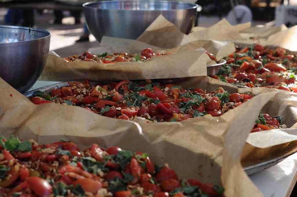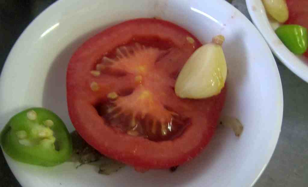 פורסים עגבניות ופלפל ירוק חריף, מסדרים בתבנית על הבצל, עם מעט שום קונפי